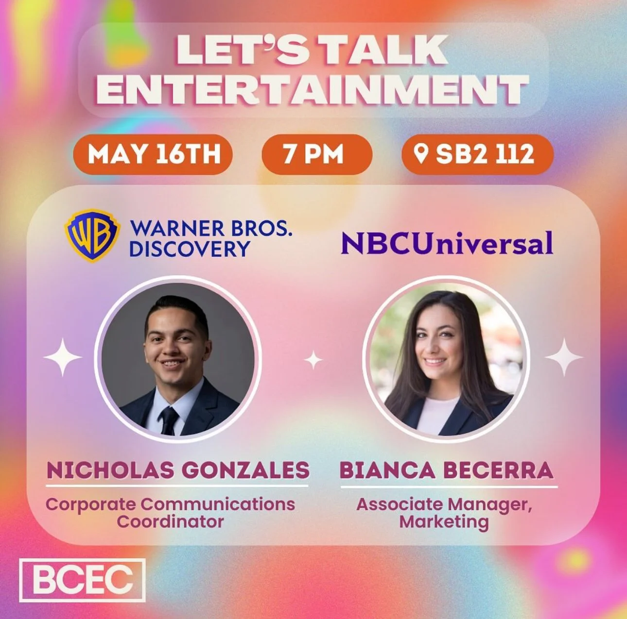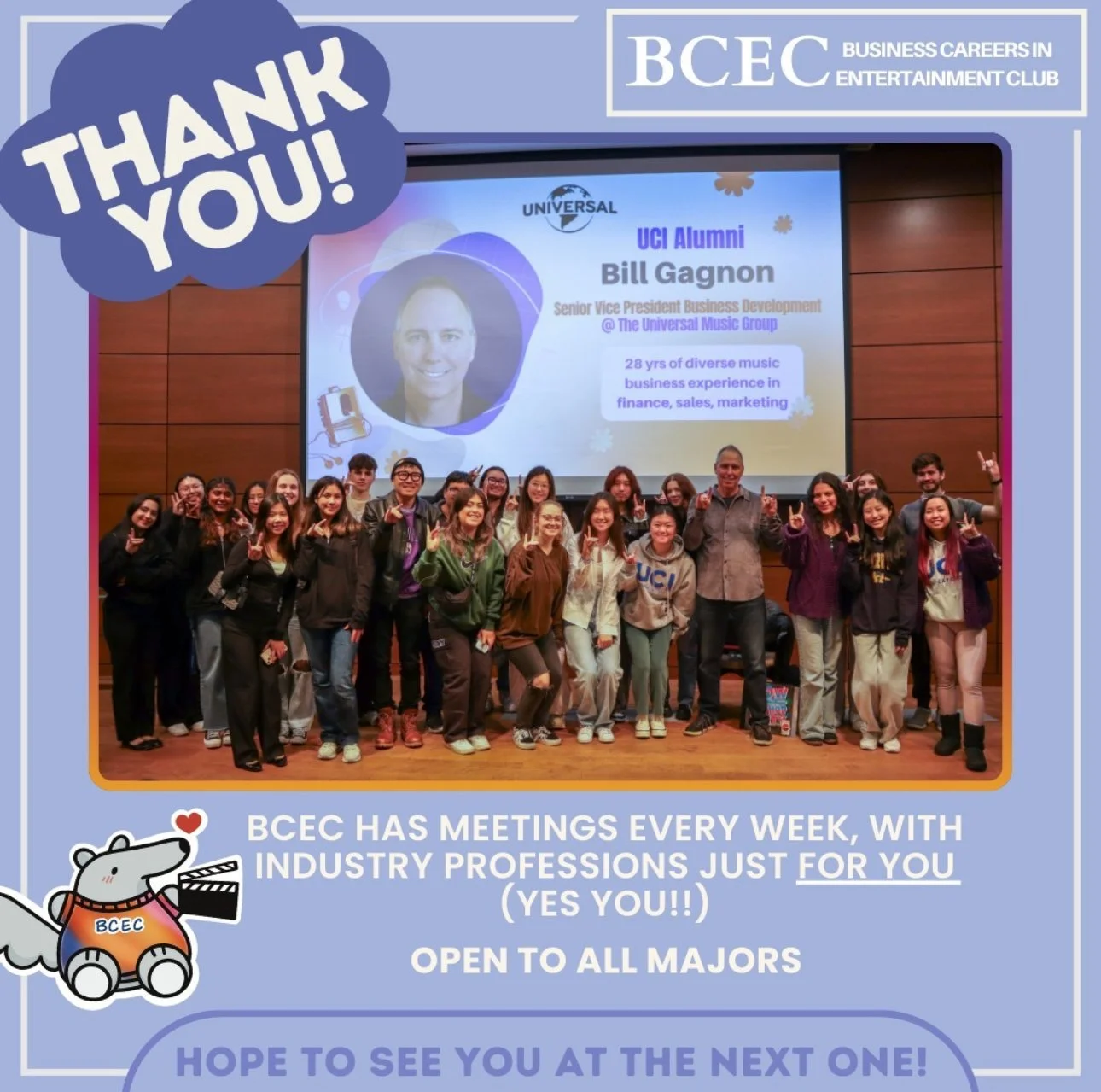 @bcecuci is a student organization from UCI’s Paul Merage School of Business that provides students with opportunities to explore what it means to have a career in the entertainment industry. They provide the essential career development mind-set and hands-on experience vital to obtaining professional entertainment networking connections, internships, and job opportunities within both the creative and business ends of the entertainment industry.